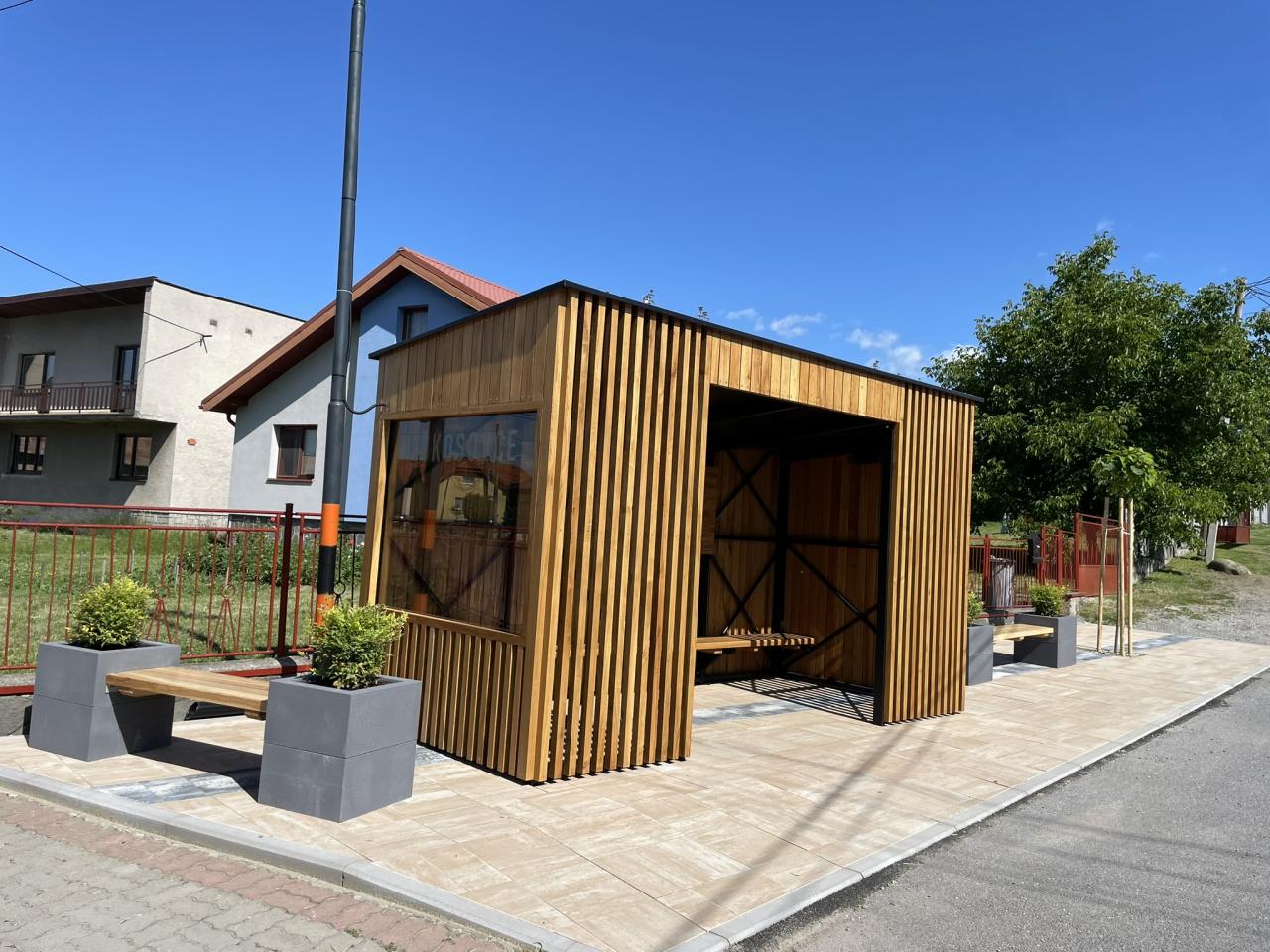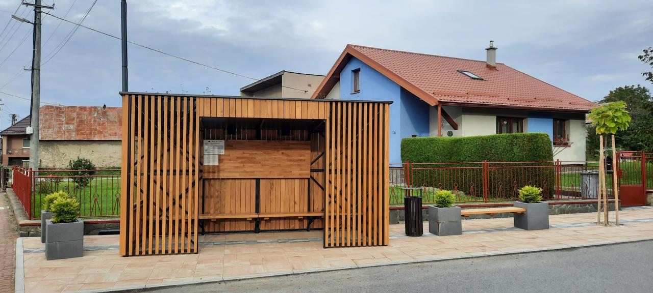Autobusová zastávka so zelenou strechou
